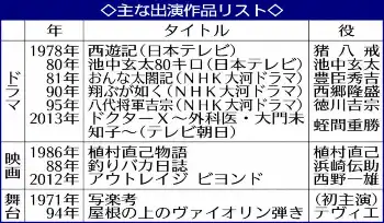 88年から三國連太郎さんとコンビを組んだ映画「釣りバカ日誌」は22作、22年に及ぶ人気作に。94年からはミュージカル「屋根の上のヴァイオリン弾き」の主人公テヴィエ役を務めた。