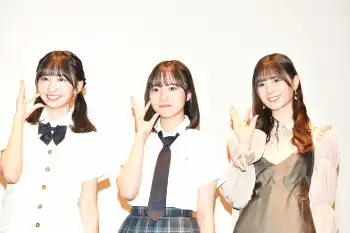 現役女子高生でもある正源司と藤嶌は、会場に集まった高校生たちの修学旅行エピソードで大盛り上がり。さらに、劇中でも憧れのアイドルとして登場する2期生の小坂菜緒が花束を持って駆けつけ、後輩を激励した。