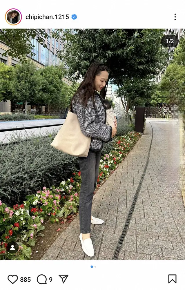 「アウターとか着てたら わ、赤ちゃんいたの!ってよく言われます 笑 よーーーくみたら抱っこされてる、おとなしい三女 笑」とつづると、ツイードのジャケット、黒のデニム、白のローファー姿で三女を抱く自身のショットをアップ。