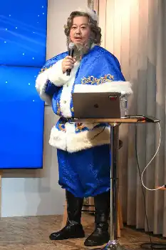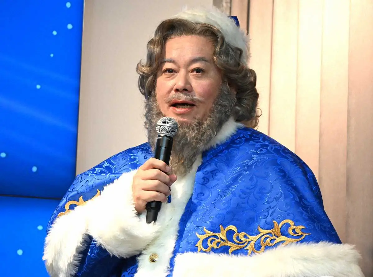 なじみのある赤い衣装ではなく、青いサンタクロースの衣装で登場。2018年から、堀江氏が主役・プロデュースを務めるミュージカル「クリスマスキャロル」を上演。今年からは、新作のミュージカル「ブルーサンタクロース」となる。これまでの公演とは異なるコンセプトで、身も心も新たなスタートを切った。