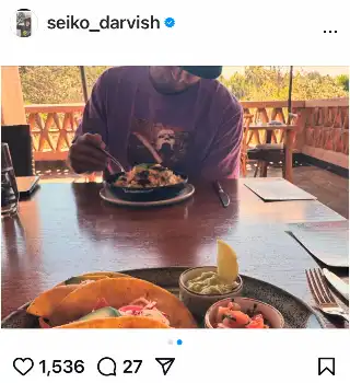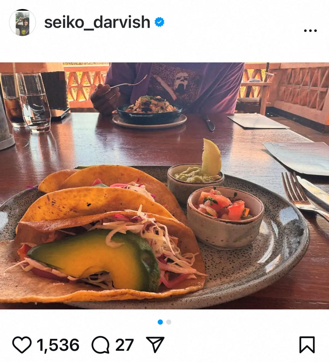 この日も、「そろそろお気づきかと」と記し、タコスの写真を投稿。奥には男性の姿が…。チラりと見えるのは夫のダルビッシュだと思われる。