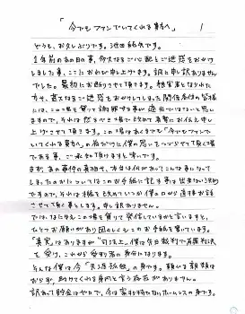 手紙の中で、「僕は先日裁判で有罪判決を受け、これから受刑者の身分になります」と報告。「僕は今天涯孤独の身です」と明かし、ファンへ向け「もしも今でもまだ貴方が僕のファンでいてくれるとするならば、お手紙を頂くことはできませんでしょうか?」と懇願。ファンの言葉が自身の希望になるとし、東京拘置所の住所を指定。1カ月後に刑務所に移送されると明かし、「面会もいらしてください」と呼びかけていた。