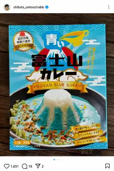 柴田は「お土産」とコメント。「青い富士山カレー 奥さんが作ってくれたのだがまさかのブルーの皿に盛ってきた」と、青い皿に盛り付けられたレトルトカレーを食べる様子を公開した。