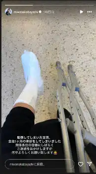 中林はインスタグラムのストーリーに「転倒してしまい左足首、全治1ヶ月の骨折をしてしまいました」とつづると、ギプスをし、松葉杖を添えた自身の足のショットをアップ。