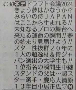 TBS「ドラフト会議2024」のスポニチ東京版紙面のラテ欄