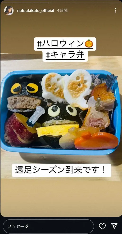 今年5月に第4子となる女児を出産した女優の加藤夏希(39)が25日までに自身のインスタグラムのストーリーズを更新。手作りの“ハロウィーン・キャラ弁”を公開した。