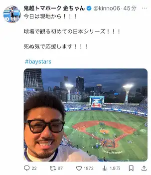 ベイ党の鬼越・金ちゃん ハマスタで日本S第2戦観戦「今日は現地から」「死ぬ気で応援します」