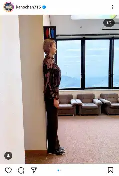 その後、トイレの前での写真を披露。1メートル84の狩野さんが靴を履いた状態でぴったりとトイレ表示にはまっており、「トイレの表示がちょうど185cmだったよ」と報告したもの。