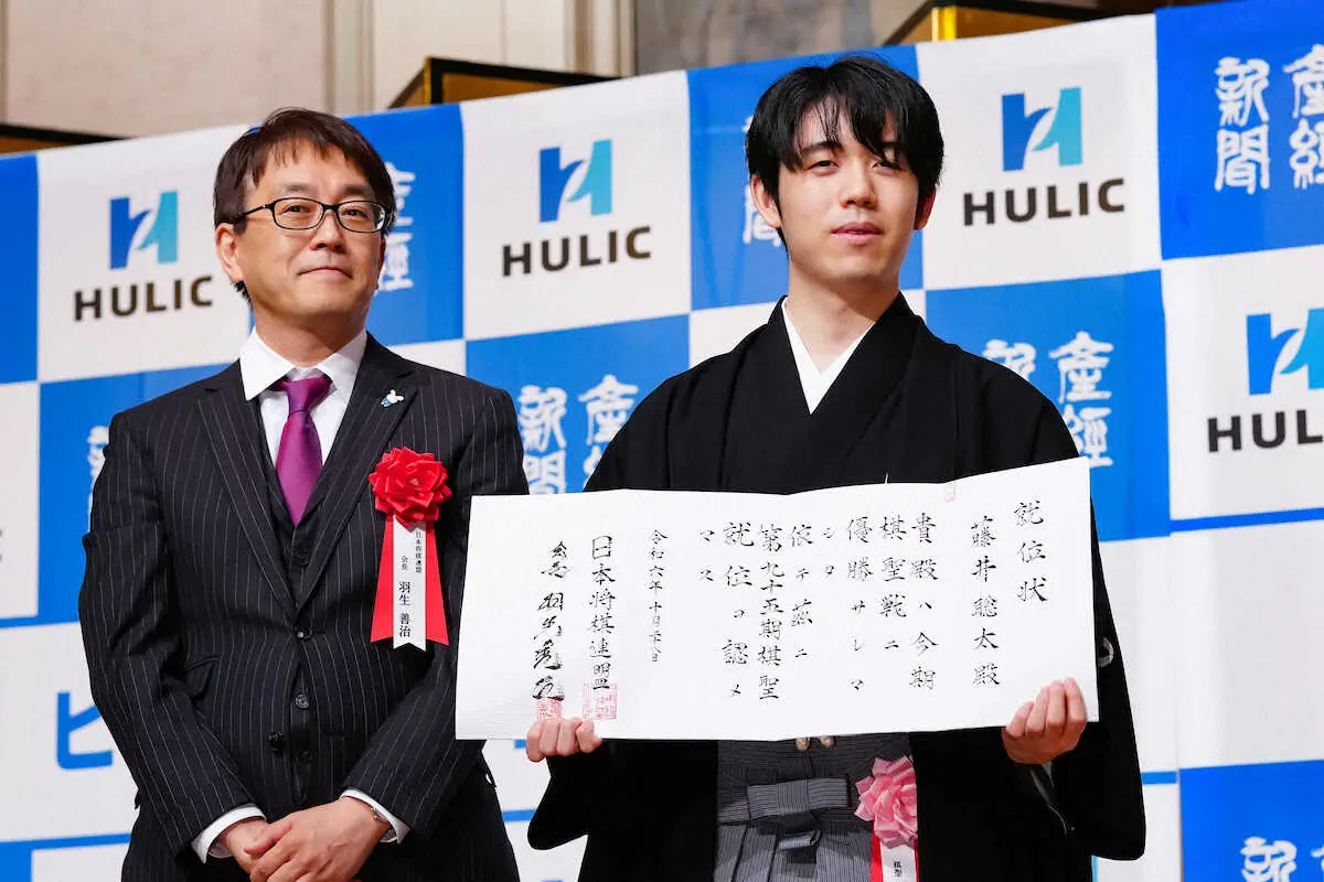 <ヒューリック杯第95期棋聖戦就位式>脇田菜々子女流初段から花束を贈られ笑顔を見せる藤井聡太棋聖(撮影・会津 智海) Photo by スポニチ 永世資格獲得の藤井聡太棋聖「より一層の研さんを積んでいきたい」 ギャラリーで見る この記事のフォト 2024年10月28日の画像一覧 もっと見る 2024年10月28日の画像をもっと見る