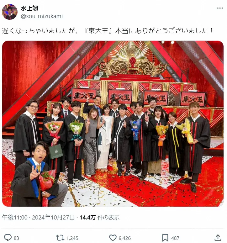 TBSのクイズ番組「東大王」に出演していた、元タレントの水上颯さん(29)が、28日までに自身のX(旧ツイッター)を更新。同番組最終回のオフショットを公開した。