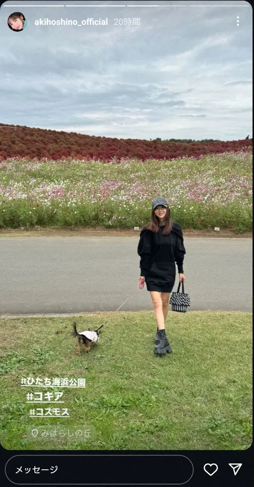 「♯ひたち海浜公園 ♯コキア ♯コスモス きはらしの丘」とつづり、ミニスカなど黒で統一したコーディネートで茨城県ひたちなか市のひたち海浜公園を散歩しているショットをアップした。