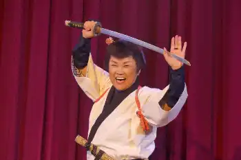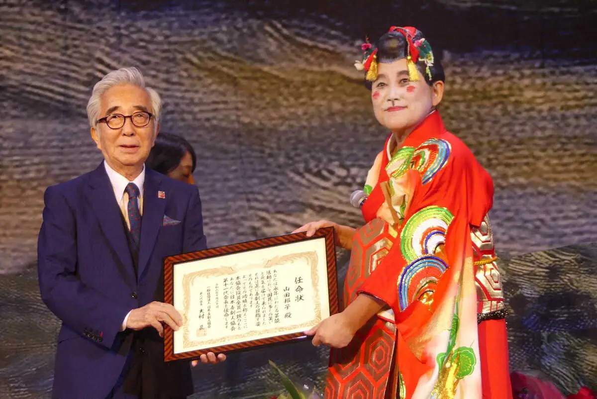 サプライズで登場した8代目会長の大村崑(92)から任命状を受け取り「こんな私でよいのでしょうか」と謙遜しつつ「歌手の友達、役者の友達、お笑いの友達、みんなと力を合わせてやっていこうと思います」と意気込んだ。