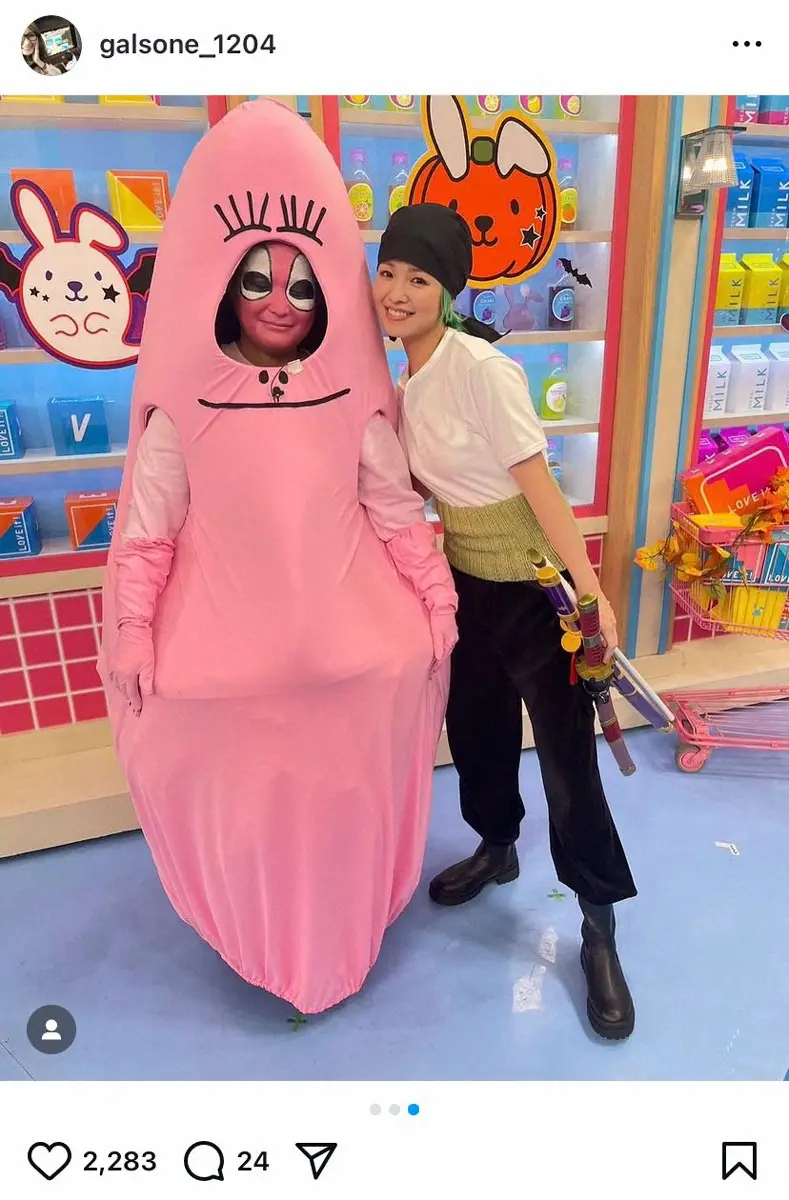 横田真悠扮する大人気漫画「ONE PIECE」ゾロとのツーショットを公開し、「ねぇ、ゾロカッコよすぎなんだけどー」と横田を絶賛。そして、ハッシュタグで「さて私はなんでしょう」と問いかけた。