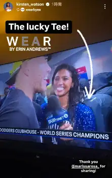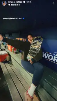 ドジャース戦を中継するスポーツ専門局「スポーツネットLA」のリポーター、キルステン・ワトソンさんは試合後に自身のインスタグラムを更新。ヤンキースタジアムのベンチ内に腰をかけ、ワールドシリーズの優勝トロフィーを掲げる写真をストーリーズに投稿し、「おやすみ、ドジャースファン」とつづった。また、お決まりとなったシャンパンファイト中のびしょ濡れ写真やリポーター仲間とともに取材でびしょ濡れになった写真などを投稿した。