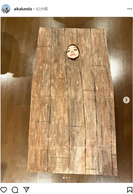 「今年は手作りで、フローリングに仮装しました」とまさかの床材に変身。全身タイツに段ボールを貼り付けた様子をアップした。