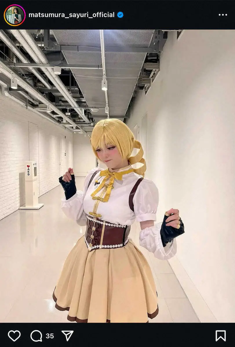 タレント松村沙友理(32)が1日までに自身のインスタグラムを更新。テレビアニメ「魔法少女まどか☆マギカ」の巴マミのコスプレ姿を投稿した。