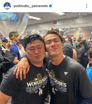 インスタグラムでは大谷らとシャンパンファイトではしゃぐ写真や移動のバスの車内でワールドシリーズの優勝トロフィーを掲げる写真などを投稿。最後は通訳としてサポートしてくれた園田芳大氏とシャンパンファイトの際に顔を寄せ合う仲睦まじい写真だった。