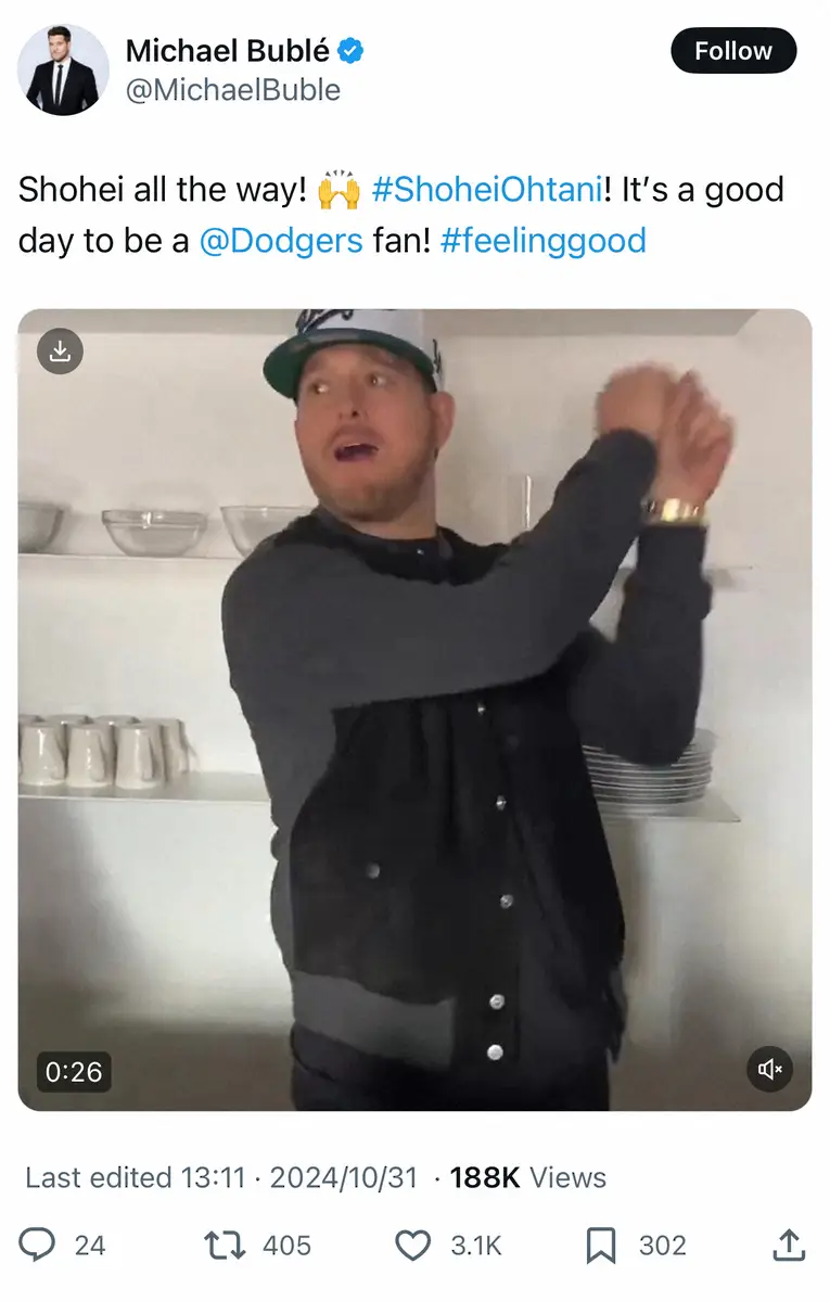 ドジャース大谷翔平投手(30)の登場曲を歌う歌手のマイケル・ブーブレ(49)が1日までに自身のXを更新。大谷の活躍に大喜びした。