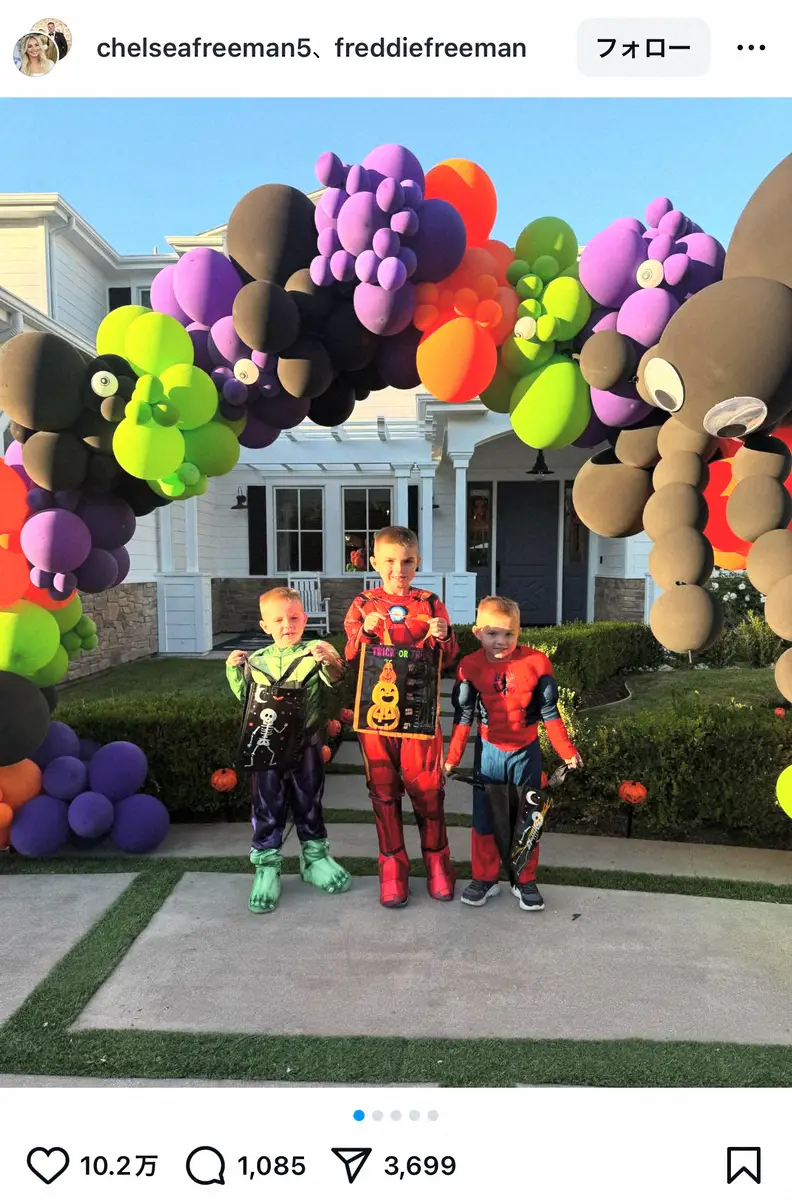ところが優勝から一夜明け、今度は“よきパパ”として活躍。チェルシー夫人は「ある夜、あなたはワールドシリーズで優勝する... 次の夜、あなたは子供たちとトリックオアトリート」というメッセージとともに、3人の息子が「スパイダーマン」など人気キャラクターに扮した様子を投稿。さらにお菓子をもらう息子と手をつなぎながら近所を回るフリーマンの姿も動画に収められていた。