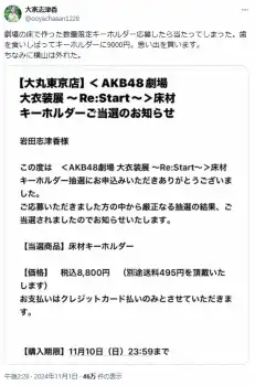 「劇場の床で作った数量限定キーホルダー応募したら当たってしまった。歯を食いしばってキーホルダーに9000円。思い出を買います。ちなみに横山は外れた」とし、当選を通知するメールのスクリーンショットを投稿した。