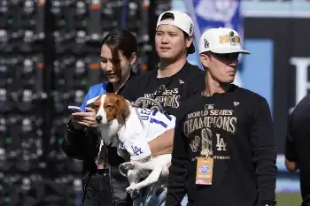 43年ぶり12度目となったヤンキースとの東西名門対決を制しての凱旋。ロサンゼルスは熱狂に包まれた。選手たちは2階建てバス7台に分かれて乗車。大谷は3台目のバスに乗車し、黒の優勝Tシャツにジーンズ姿で真美子夫人が横に座っていた。