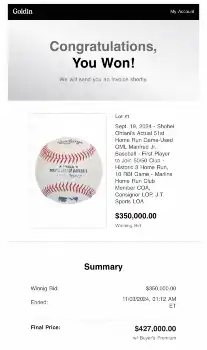 同社の公式Xは、落札決定後「大谷翔平51号ホームランボールの最終販売価格は42万7000ドル。51号ホームランボールは、大谷翔平選手が3本塁打10打点の大活躍を見せ、史上初の50/50クラブ入りを果たした時のものです」と投稿した。