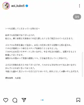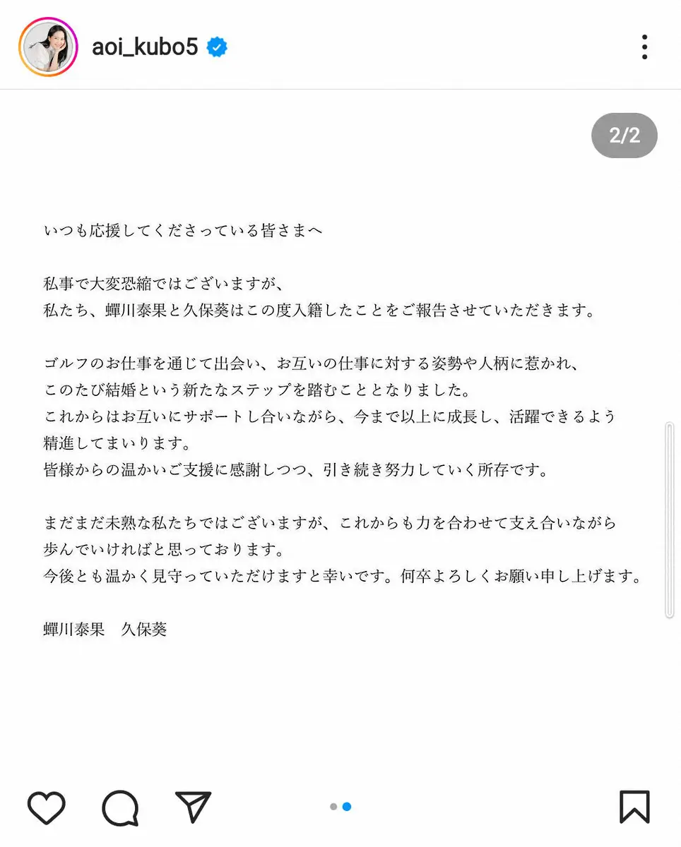 久保葵のインスタグラム(@aoi_kubo5)から 久保葵 プロゴルファー・蝉川泰果との結婚発表「お互いの仕事に対する姿… ギャラリーで見る この記事のフォト 2024年11月03日の画像一覧 もっと見る 2024年11月03日の画像をもっと見る
