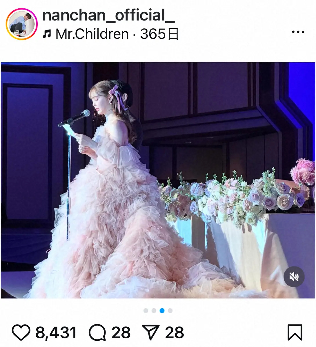 「スピーチはドキドキでしたが、これもいい経験をさせてもらいました」とスピーチも行ったことを報告。「ニコルン夫妻の細やかな心遣いのあるとても楽しく温かい披露宴でした」とつづった。