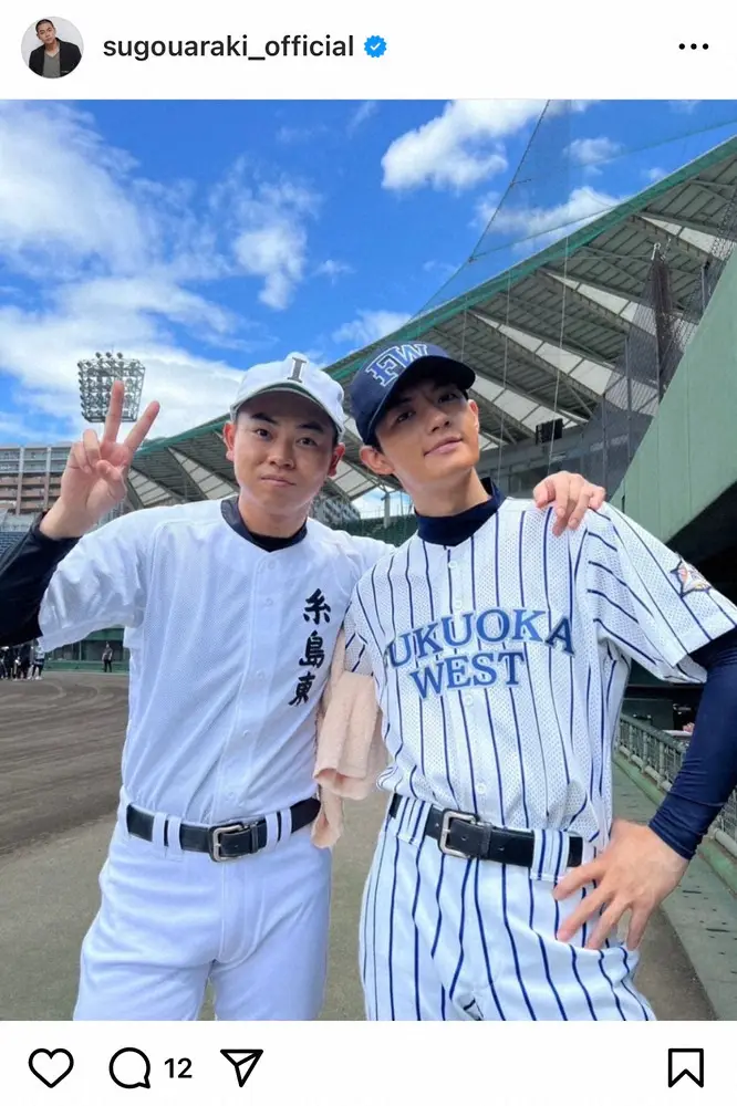 菅生新樹 朝ドラ「おむすび」佐野隼斗との2ショット披露 自身が演じる役に「モテへんからやめとけよ!」