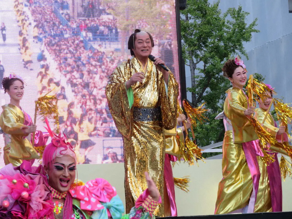 おなじみ、金ピカの着物で登場した松平。移動する車の上から沿道の観客に手を振りながらサンバを披露し「素晴らしいですね。楽しかったです。移動して歌うのは初めてだったので」と笑顔。「大阪は皆さん明るくて、パワーもらいますね。この勢いで来年の大阪(関西)万博もたくさんの人に見て頂いて、ぜひ成功してもらいたいと思います」とエールを送った。