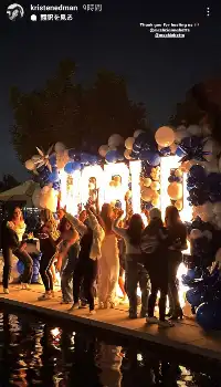 高台のプールもある場所で開催され、「WORLD SERIES」の電飾や青と白の風船の前シャンパンタワーも設置。大谷の真美子夫人の姿は見えなかったが、10人以上の選手の夫人たちがダンスをする姿も投稿された。