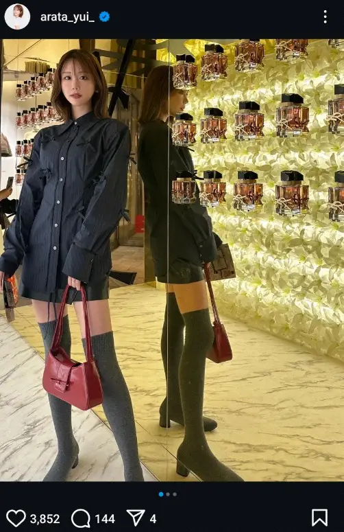 モデルのあらた唯(27)が4日までに自身のインスタグラムを更新。ミニ&ソックスブーツ姿を披露した。