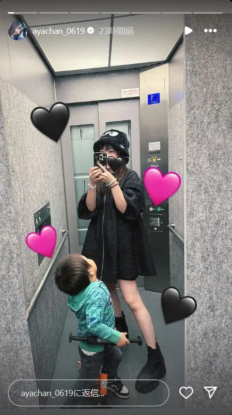 あやなんは、エレベーターで息子と自撮りした写真をアップ。すると、足の細さに反響が寄せられたようで「1つ前のストーリーの足を見て、なんでそんなに足細いの?!なんかしてる?というDMがめっちゃあったんだけど (あざす)」と投稿した。