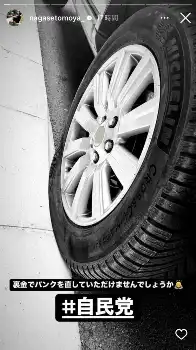 長瀬は10月に「裏金でパンクを直していただけますでしょうか」と、パンクした自動車のタイヤの画像を投稿。大文字で「#自民党」とつづり、裏金問題への皮肉をつづっていた。