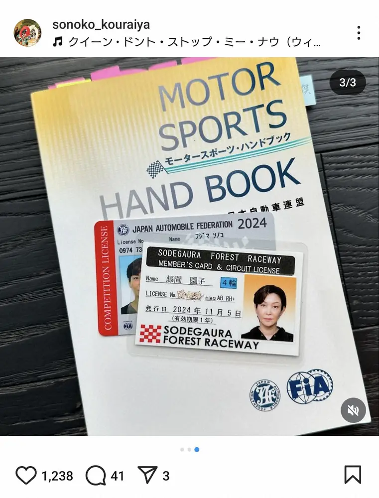 サーキットでの走行を楽しんだ様子で、サーキットのライセンスの画像も投稿すると、ハッシュタグでは「国内A級ライセンス取得」「Bライとの壁は厚かった」「あいにくの曇り空だったけど」「最高に楽しかった」「袖ヶ浦フォレストレースウェイ」などと添えた。
