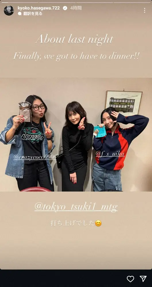 長谷川はストーリーズで「About last night(=昨夜)」と切り出し、「Finally, we got to have to dinner!!(=ついに食事に行けました)」と報告した。