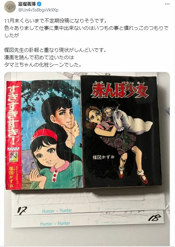 冨樫氏は楳図さんの作品「すきすきすき!」「赤んぼ少女」を自身の原稿の上に重ねた写真をアップ。「漫画を読んで初めて泣いたのはタマミちゃんの化粧シーンでした」としのんだ。