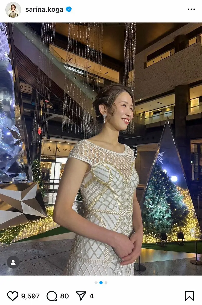 ゴールドとシルバーで装飾された白いロングドレス姿の写真を投稿した古賀さん。1メートル80の長身が華やかに映えるスレンダーラインのドレスを着こなし、髪形もアップスタイルにまとめた。