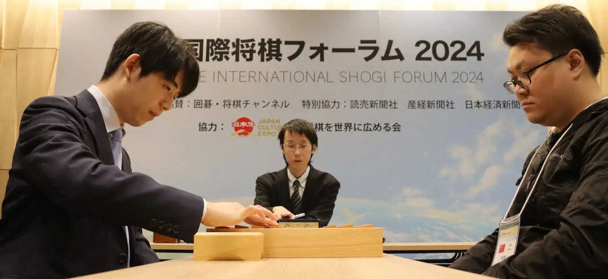 大盤解説場で記念対局を振り返る(右から)藤井聡太王将、羽生善治・日本将棋連盟会長、許諾さん(撮影・我満 晴朗) Photo by スポニチ 藤井王将、貫禄勝ち 新将棋会館で初の対局 国際トーナメント覇者に“角落… ギャラリーで見る この記事のフォト 2024年11月10日の画像一覧 もっと見る 2024年11月10日の画像をもっと見る