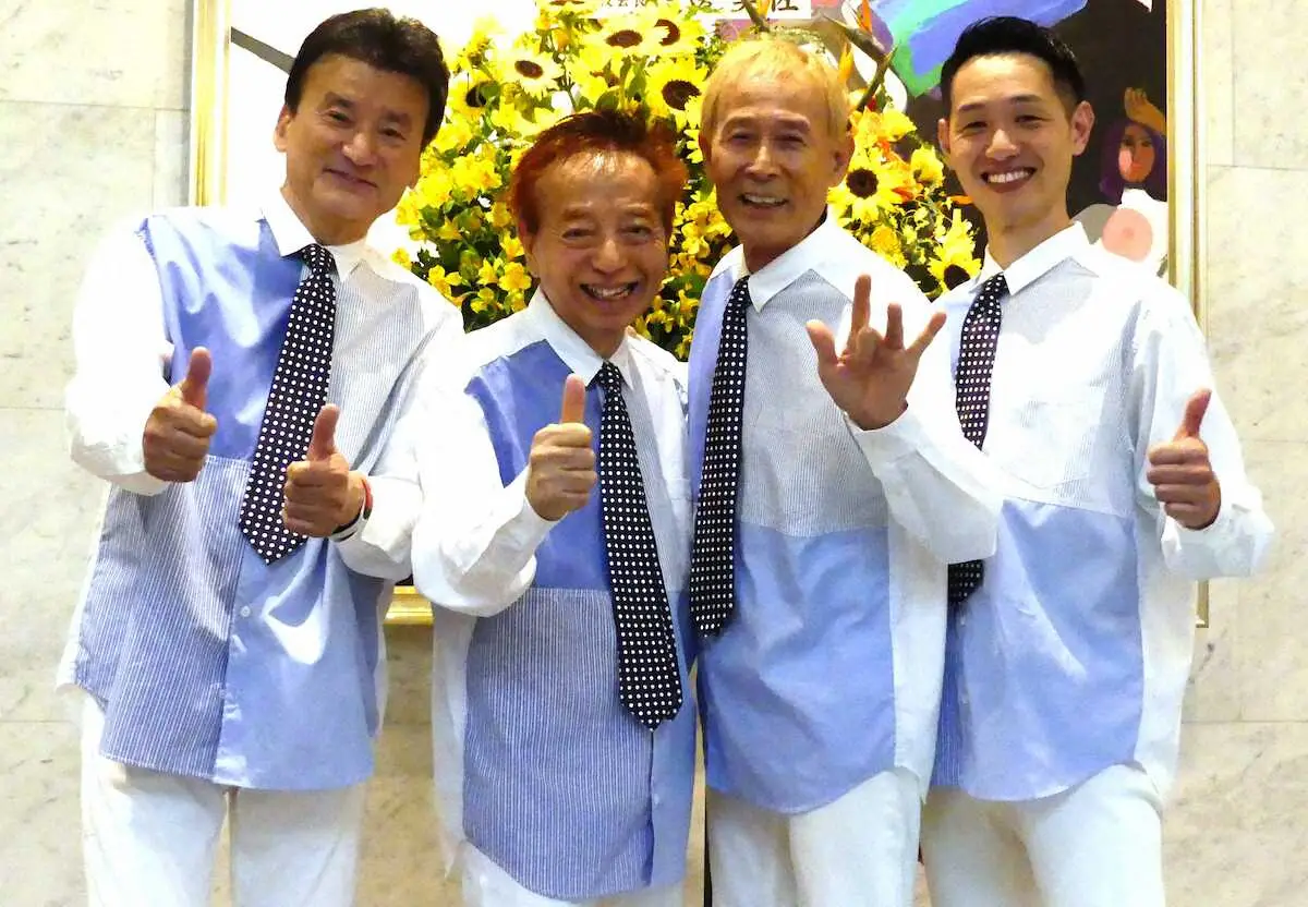 結成58周年記念コンサートを行った「ザ・ワイルドワンズ」の(左から)島英二、鳥塚しげき、植田芳暁、加瀬友貴