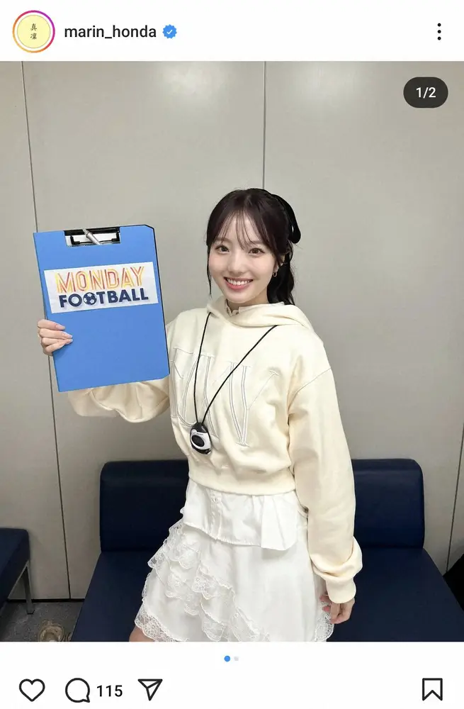 本田真凜さん 「サッカー部のマネージャーさんを意識したコーデです!」番組オフショットに「可愛い」