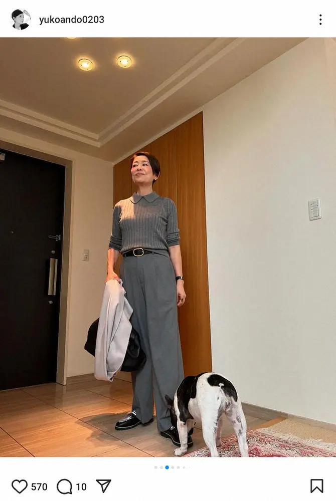 安藤氏は「かーさん出かけるってよー!と、ちょっとしたハプニング(笑) 本日はセンセイの日」とコメント。自身が客員教授を務める日のコーディネートと愛犬の写真を公開した。