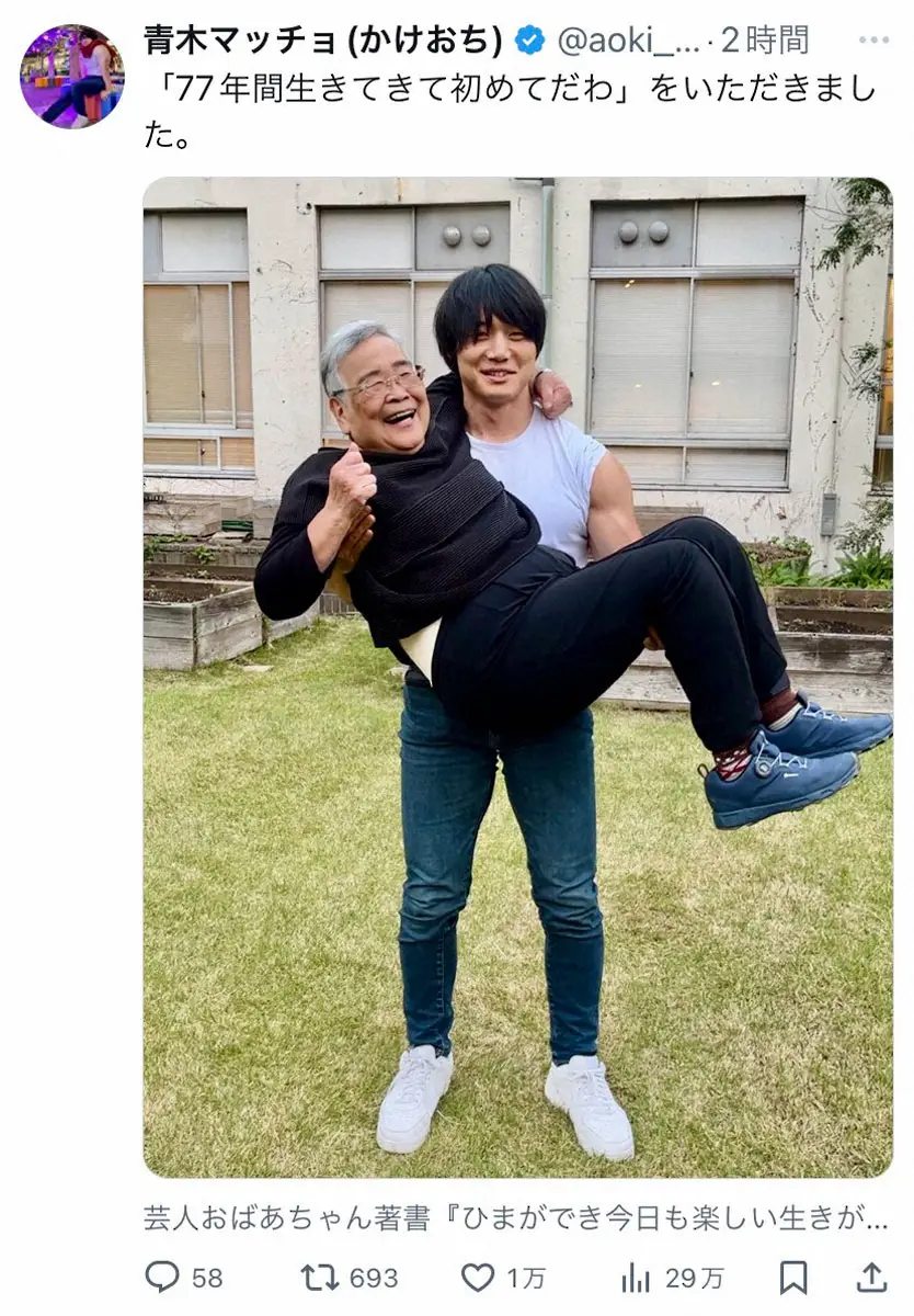 お笑いコンビ「かけおち」の青木マッチョ(29)が12日、自身のX(旧ツイッター)を更新。77歳のピン芸人・おばあちゃんをお姫様抱っこする写真を公開した。