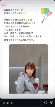 「お誕生日メッセージありがとうございます 11月12日32歳を迎えました」と報告し、赤ワインのグラスを並べ、ほほ笑んでいる写真をアップ。