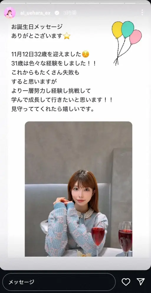 タレント、YouTuberで実業家でもある上原亜衣(32)が12日、自身のインスタグラムのストーリーズを更新。バースデーショットを公開した。