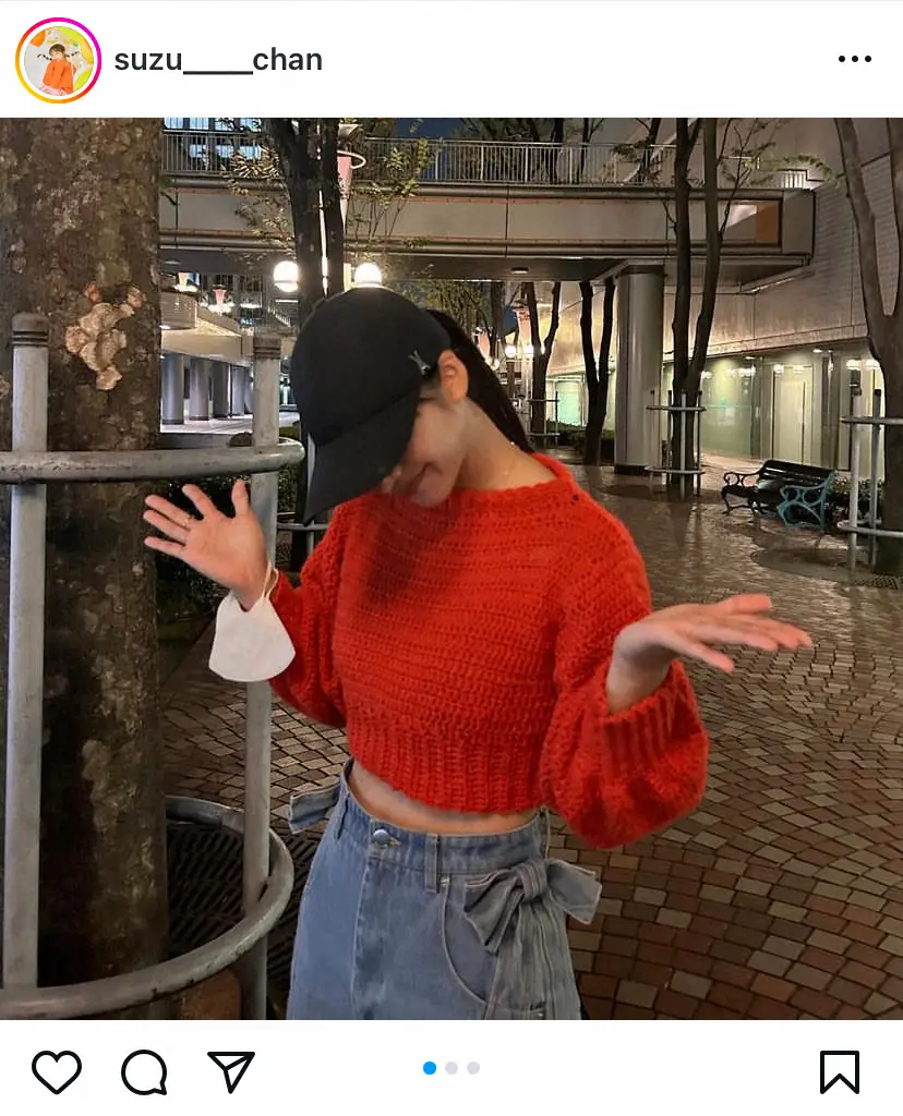 編み物が大好きだという山之内。これまで手編みのカーディガンやニット帽などの写真を投稿してきたが、この日は「赤いセーターを編んだんですけど、絶妙に丈が足りなくて」と帽子で顔を隠しつつ、実際に赤いニットを着用したショットをアップした。