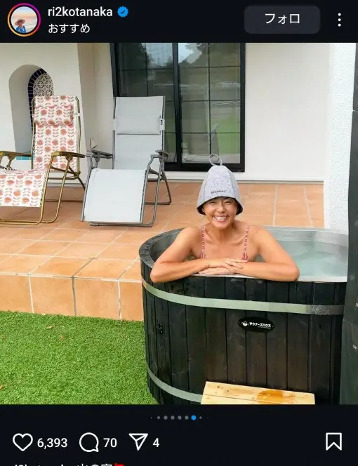 タレントの田中律子(53)が15日までに自身のインスタグラムを更新。サウナ&水風呂“入浴ショット”などを公開した。