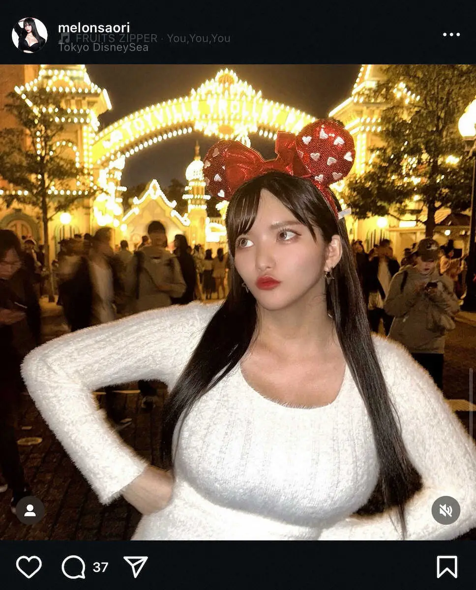 自身のインスタグラムで「白のニットセットアップ」とミニー・マウスのカチューシャを付けた白ニットコーデショットを投稿した。