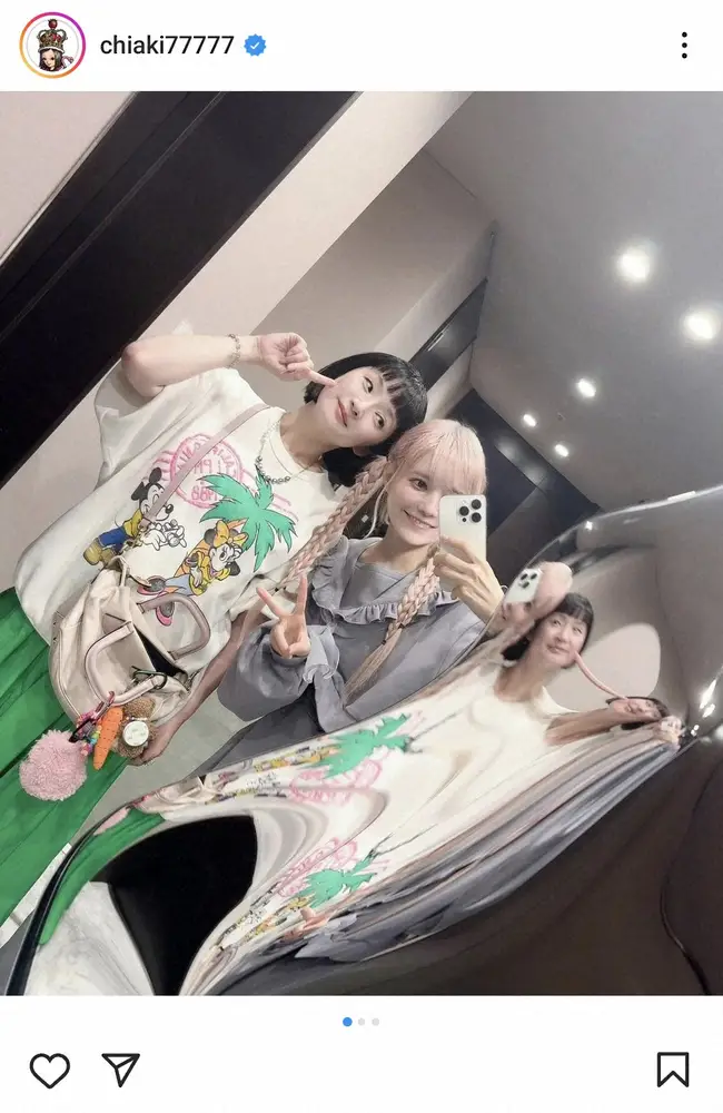 「つばさちゃんち」と書き出すと、ミッキーマウスのTシャツに緑のスカート姿の自身と、ピンクヘアで三つ編み、グレーのトップス、ボトムス姿の益若がポーズを決める自撮りショットをアップ。