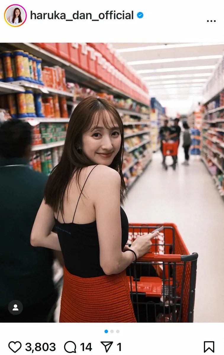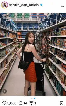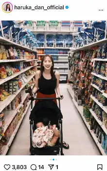 海外のスーパーマーケットでベビーカーを押すショットをアップ。フォロワーからも「幸せオーラ半端ない」「かわいい」「脚綺麗」「美肌すねー」などの声が寄せられている。